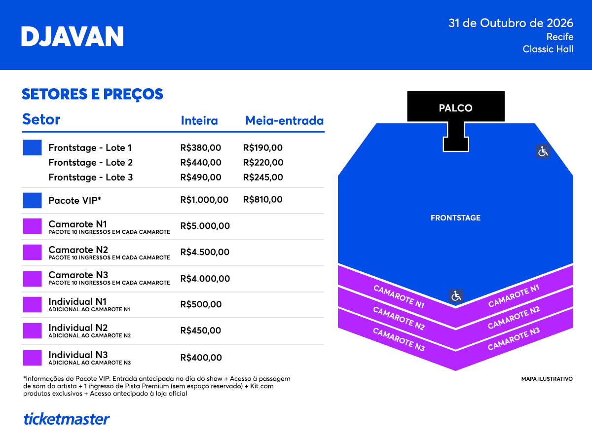 Início das Vendas: 03/12/2025 às 11h em www.ticketmaster.com.br e a partir das 12h na Bilheteria Oficial.