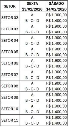 Limite de ingressos por CPF: Clientes podem comprar até 1 frisa com 6 lugares, por dia de desfile.